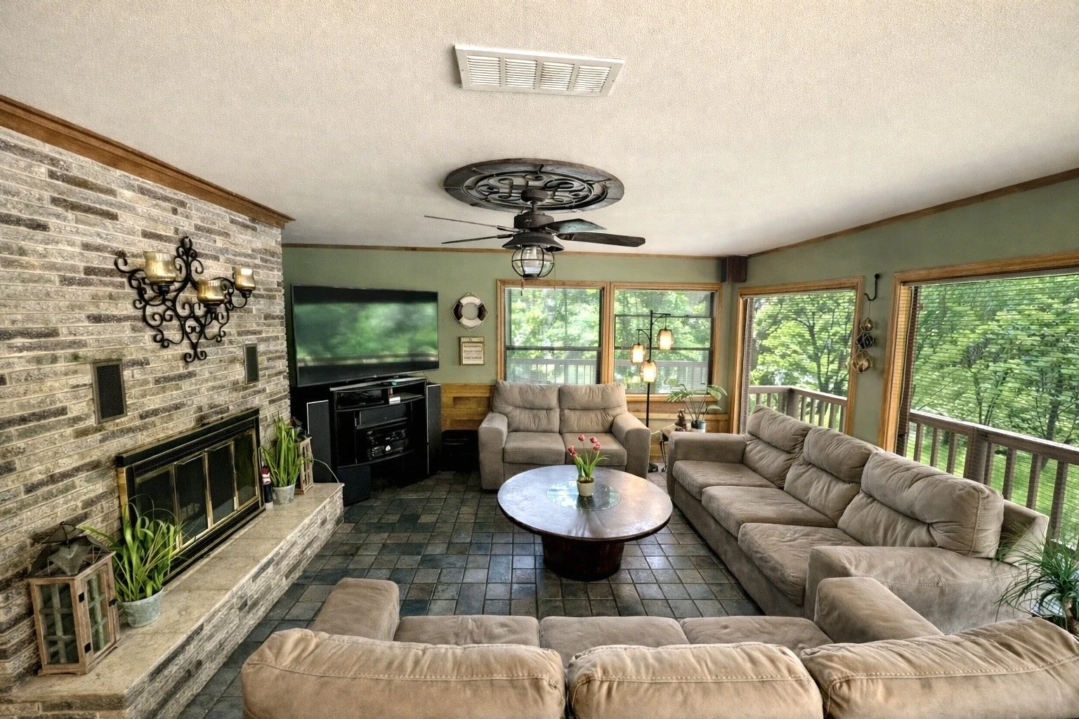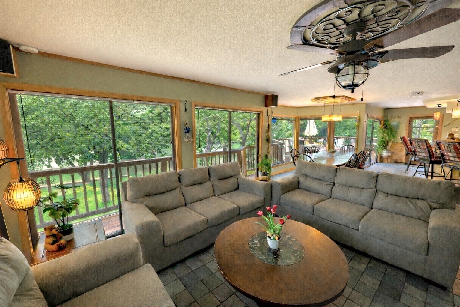 This unique setting, with 150 feet of private waterfront, offers expansive views framed by mature, towering trees and natural surroundings. With light boat traffic and no tubing congestion, this part of the river feels more private, relaxed, and settled. This calm, open atmosphere is truly unique to waterfront properties in this area.